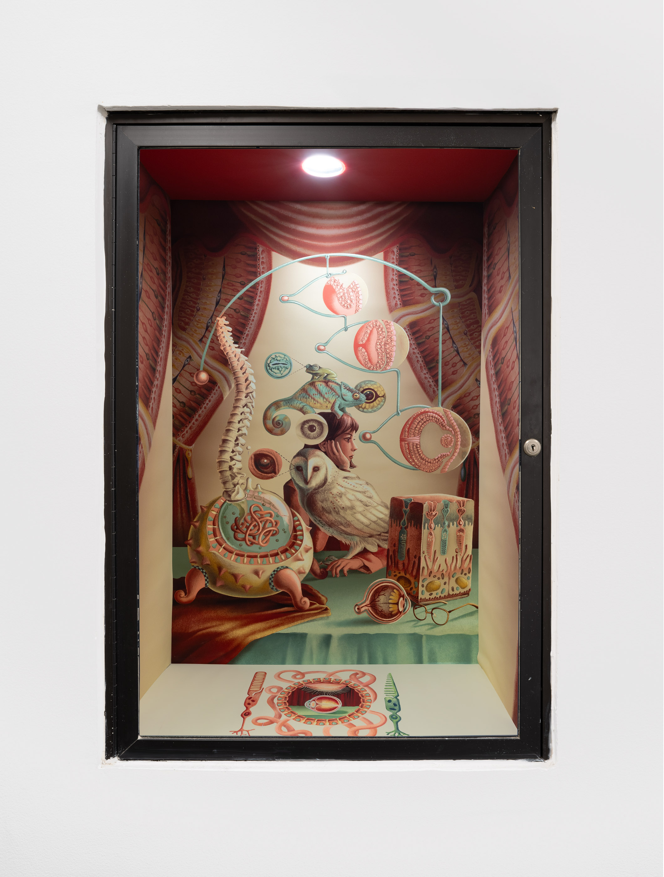 Installed in the gallery’s corridor vitrines, Symbiosis as Post-Anthropocene Metaphors is the first solo exhibition by illustrator Ada Zejun Shen in New York. Shen’s project takes a critical stance against the human-centrism of the Anthropocene and the notion of technofixing—the belief that technology alone can resolve environmental and human challenges while disregarding the complexity of reality. Inspired by Donna Haraway’s book Staying with the Trouble: Making Kin in the Chthulucene, the exhibition advocates for non-anthropocentric perspectives, emphasizing symbiosis to illustrate the entangled, chaotic, and interconnected nature of all lifeforms. Shen’s illustrations function as both an illustrated essay and a self-initiated editorial practice, developed directly from scientific articles and publications. Through this research, Shen encountered examples such as how human vision developed from bacterial gene transfer and how the placenta evolved from a viral infection. Using these prompts, her illustrations invite viewers to contemplate humanity’s place in the world—encouraging both reflection and a profound sense of connection.