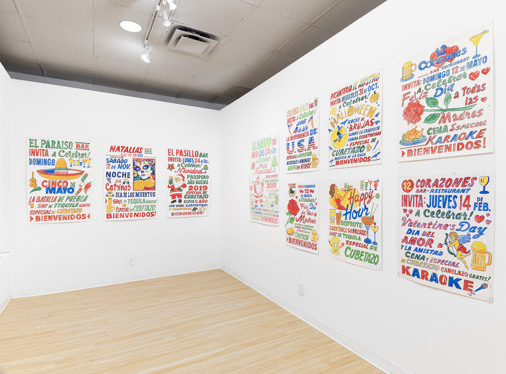 The Yeh Art Gallery at St. John’s University presents the first exhibition ever devoted to the hand-painted signs of the legendary Cevallos Brothers—Carlos and Miguel— who along with their late brother Victor have made signs, murals, and banners for many Queens and NYC-based businesses for nearly fifty years. The exhibition focuses on an archive of signs collected from small businesses along a stretch of Roosevelt Ave in Queens that connects Jackson Heights to Corona. The signs are all humbly crafted with pen and marker on standard sizes of poster paper, and are often announcements for fleeting one-day events or holidays such as Mother’s Day, Easter or Day of the Dead. Carlos and Miguel Cevallos—both in their eighties—each bring their own creative personality and expertise to their work and complement each other perfectly, with Miguel sketching the lettering and the layout while Carlos handles all of the painting and color.