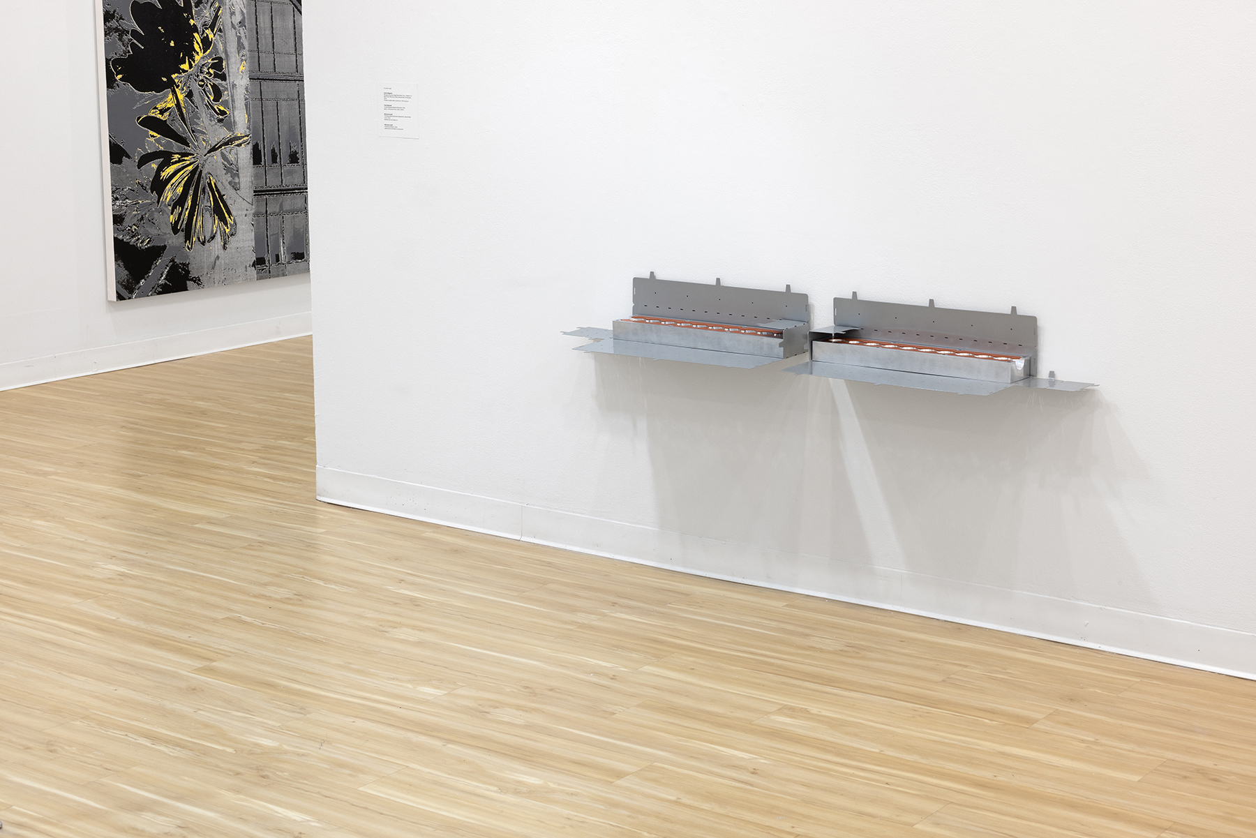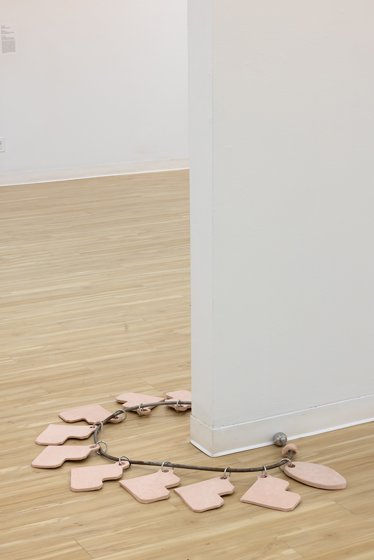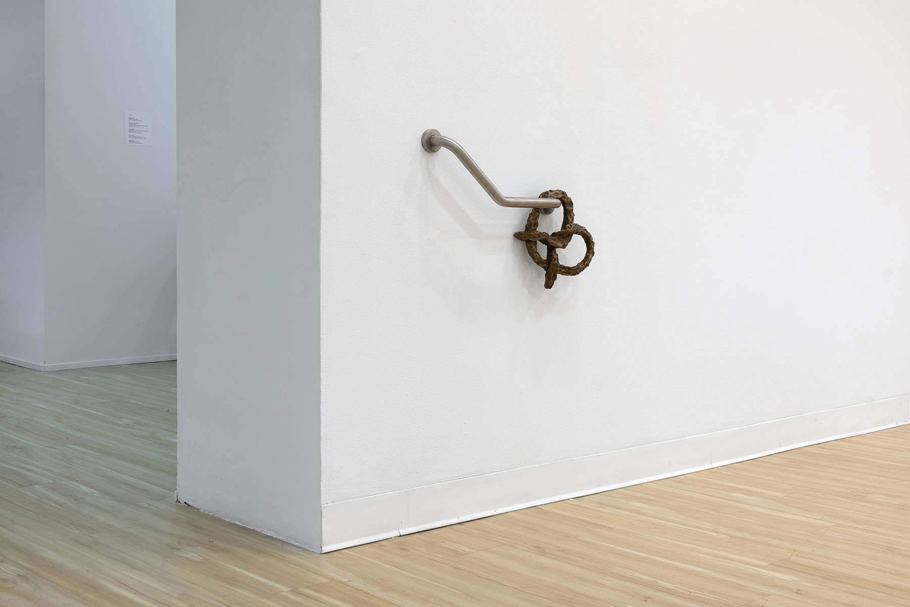 Throughout the exhibition, manufactured goods appear both as support structures and as ready-made art objects. In Mandel’s Mall Pretzel, a hand-sculpted cast bronze pretzel dangles pendant-like from a bathroom stall grab bar hung at the ADA compliant height of 33 inches from the ground—pointing to the role of the civil engineer/interior architect as the negotiator between the vulnerabilities and vicissitudes of the human body and the standardized built environment. Magaña’s security drawer works are painstaking replicas of the internal drawers of safety deposit boxes. Removed from the enclosures of imagined financial institutions, the drawers are affixed to the wall—unsecuritized and unprotected—as empty vessels of use and exchange value.