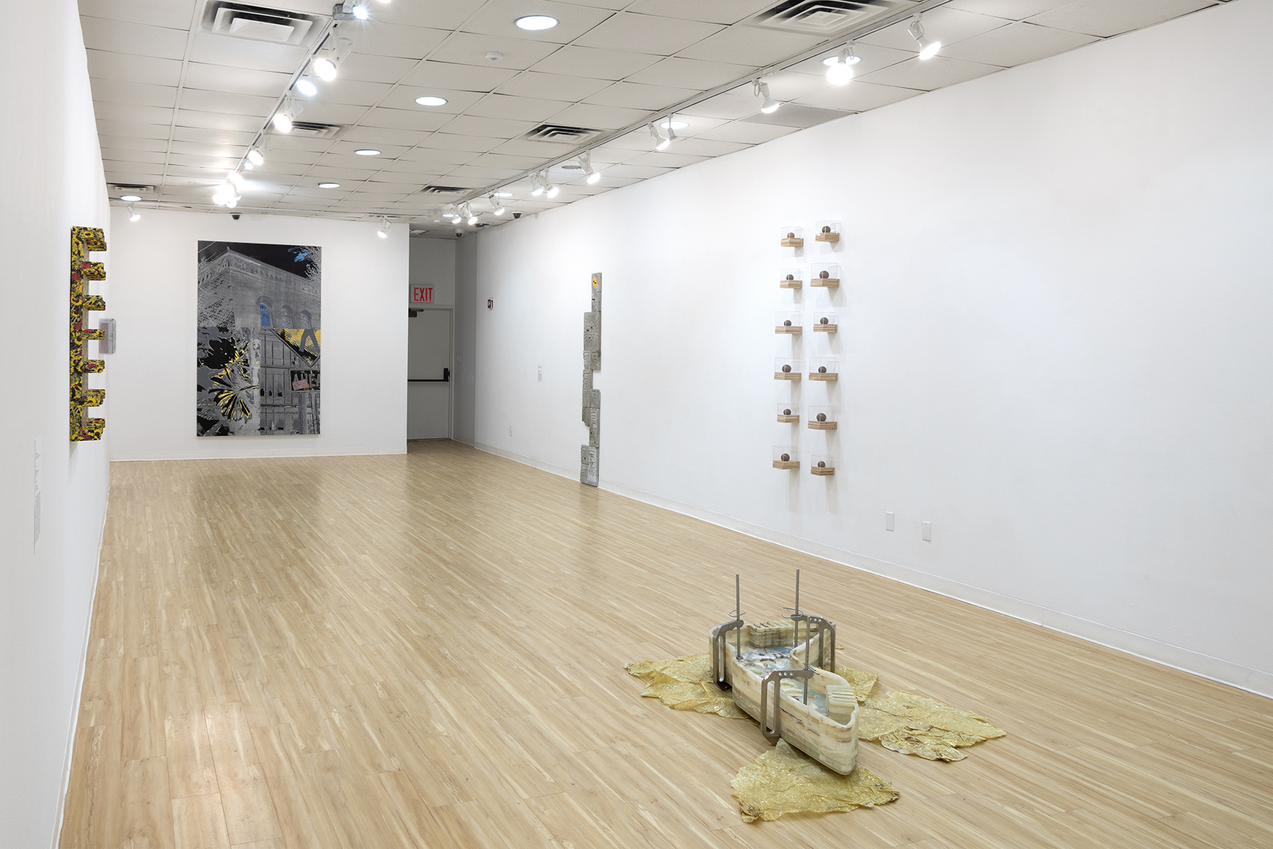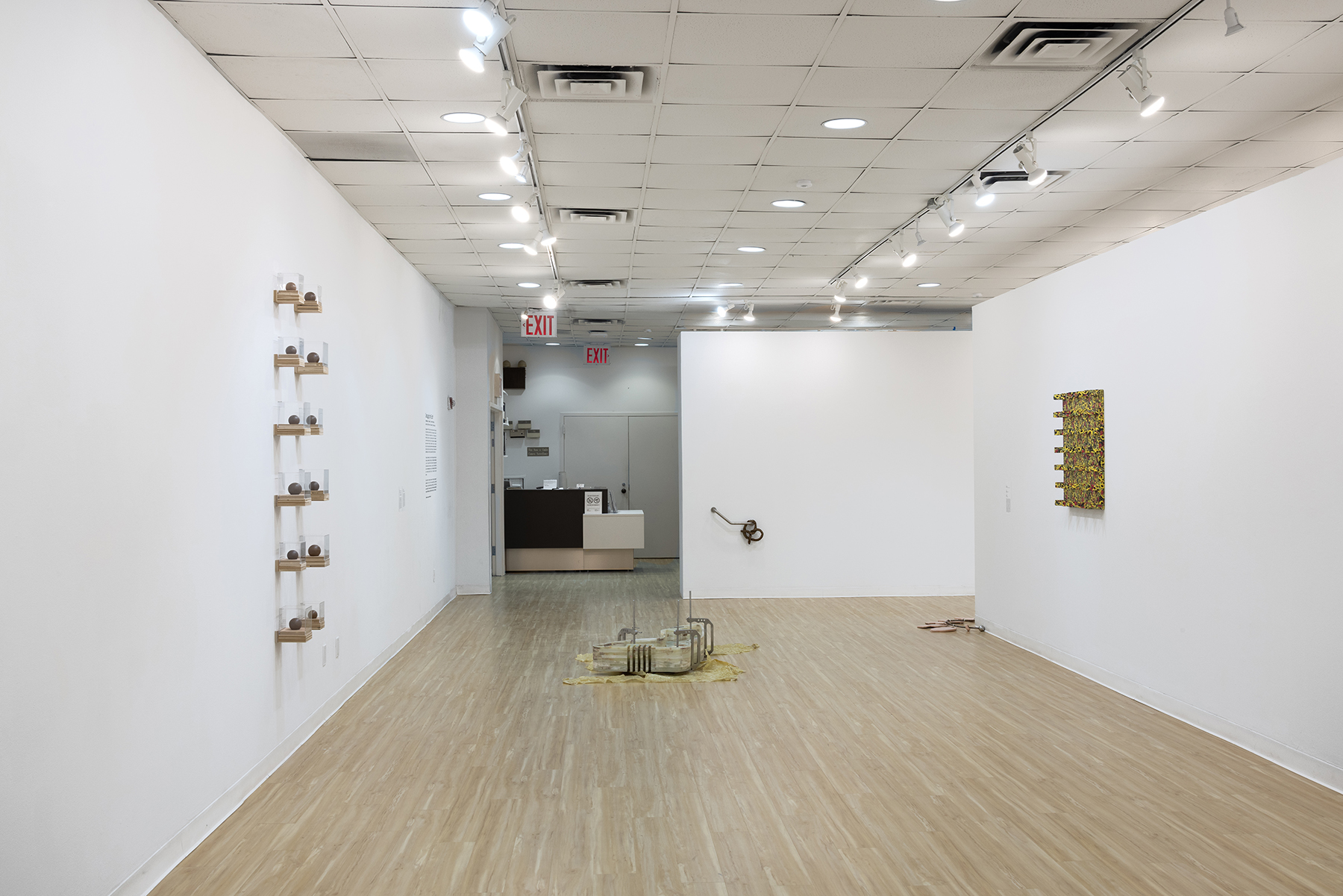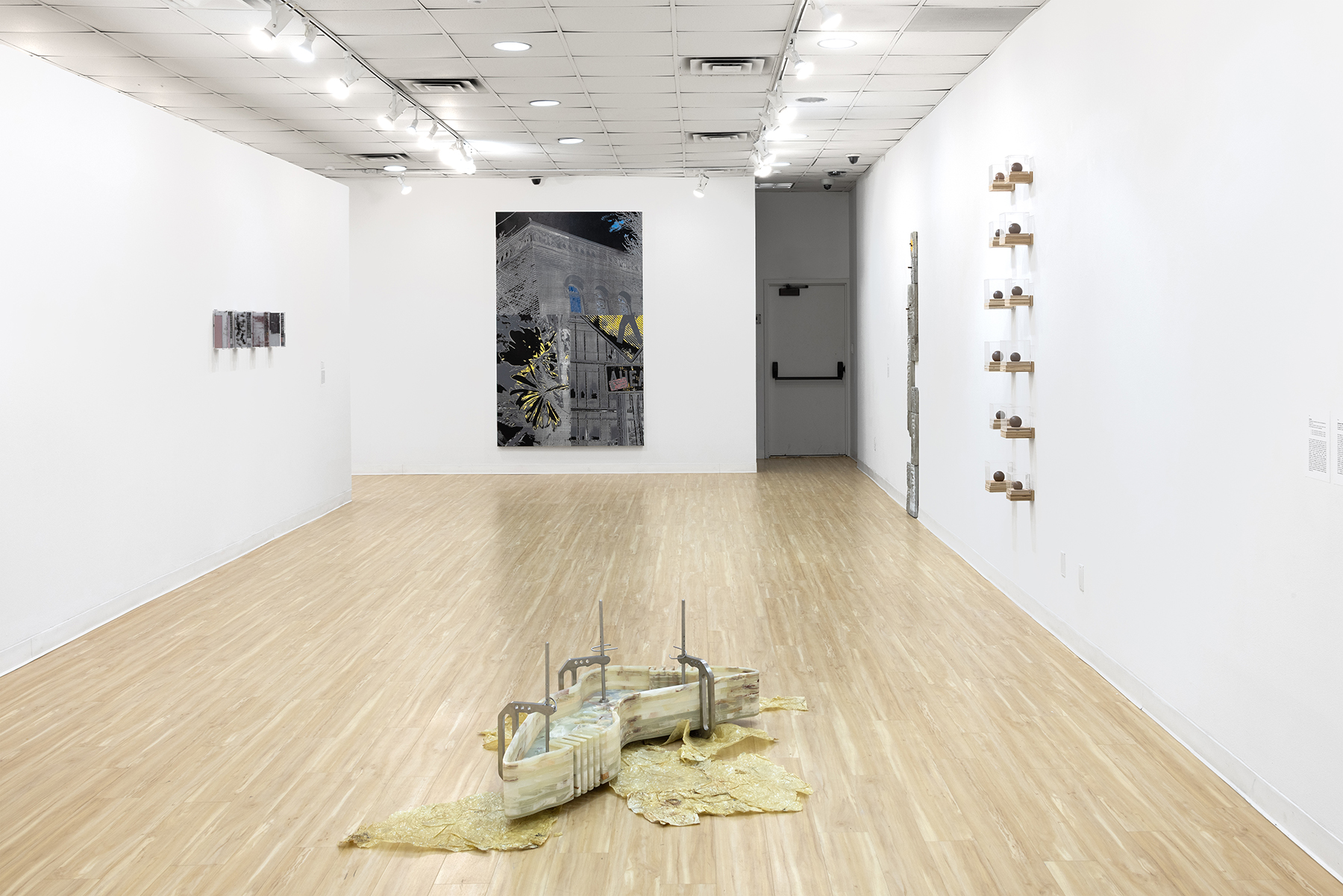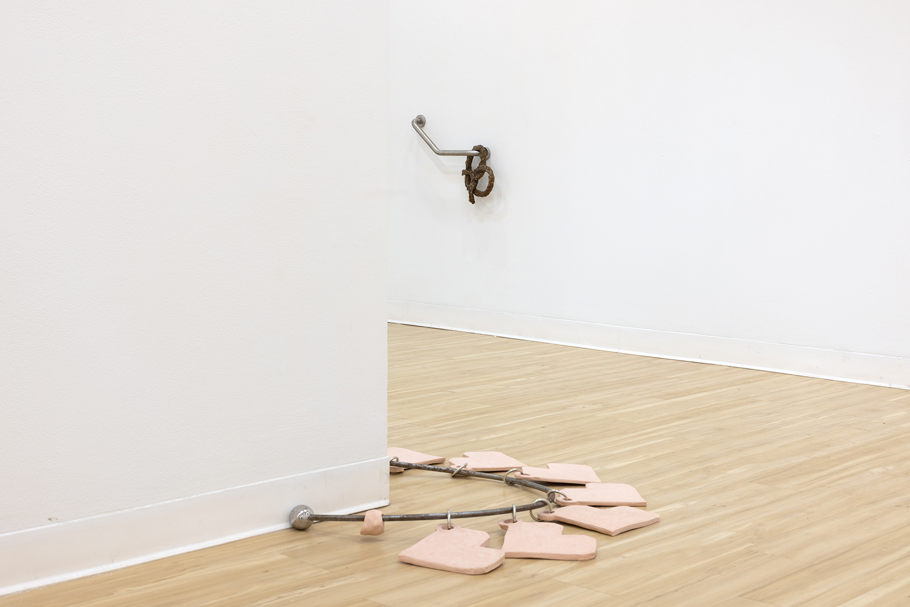 Throughout the exhibition, manufactured goods appear both as support structures and as ready-made art objects. In Mandel’s Mall Pretzel, a hand-sculpted cast bronze pretzel dangles pendant-like from a bathroom stall grab bar hung at the ADA compliant height of 33 inches from the ground—pointing to the role of the civil engineer/interior architect as the negotiator between the vulnerabilities and vicissitudes of the human body and the standardized built environment. Magaña’s security drawer works are painstaking replicas of the internal drawers of safety deposit boxes. Removed from the enclosures of imagined financial institutions, the drawers are affixed to the wall—unsecuritized and unprotected—as empty vessels of use and exchange value.