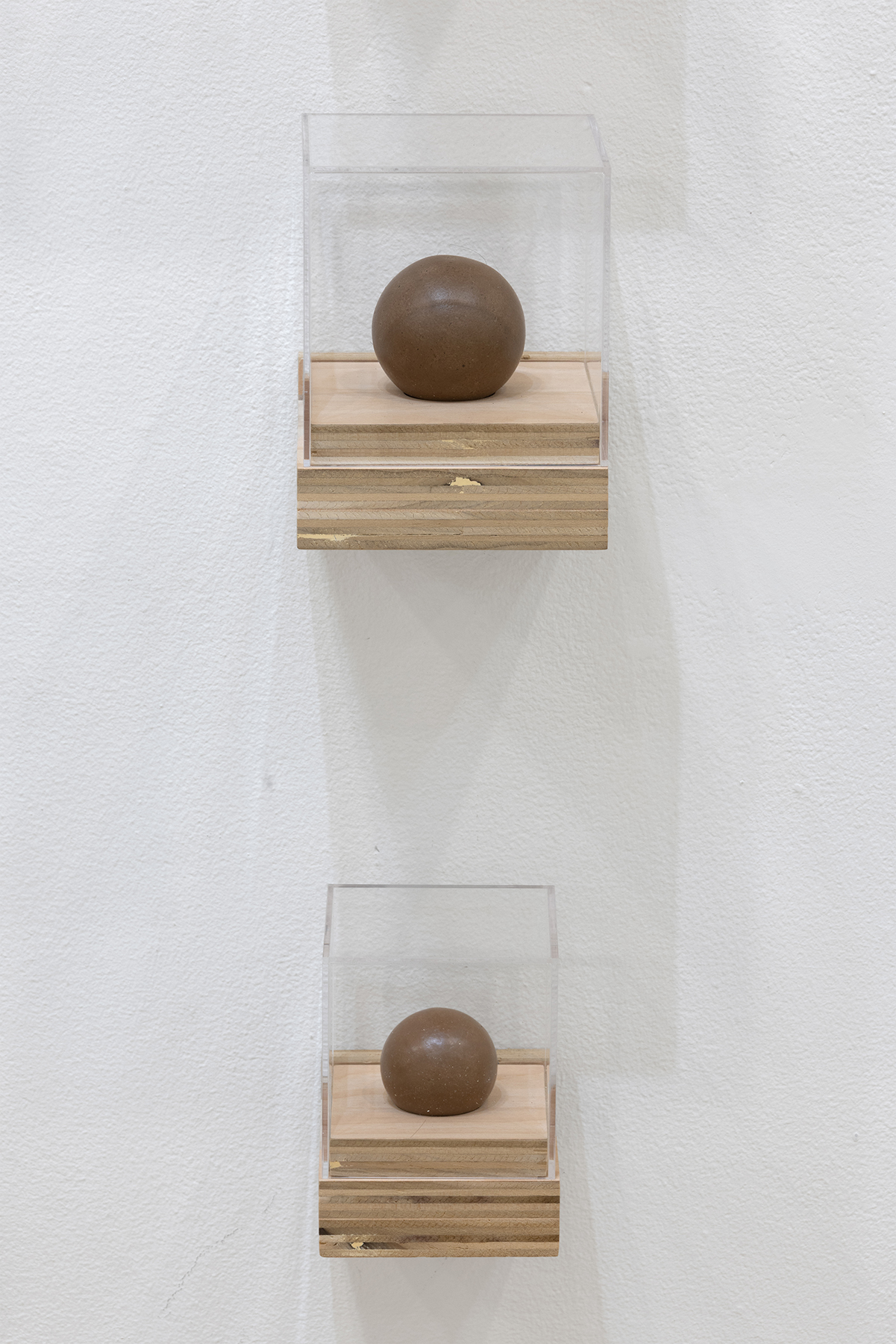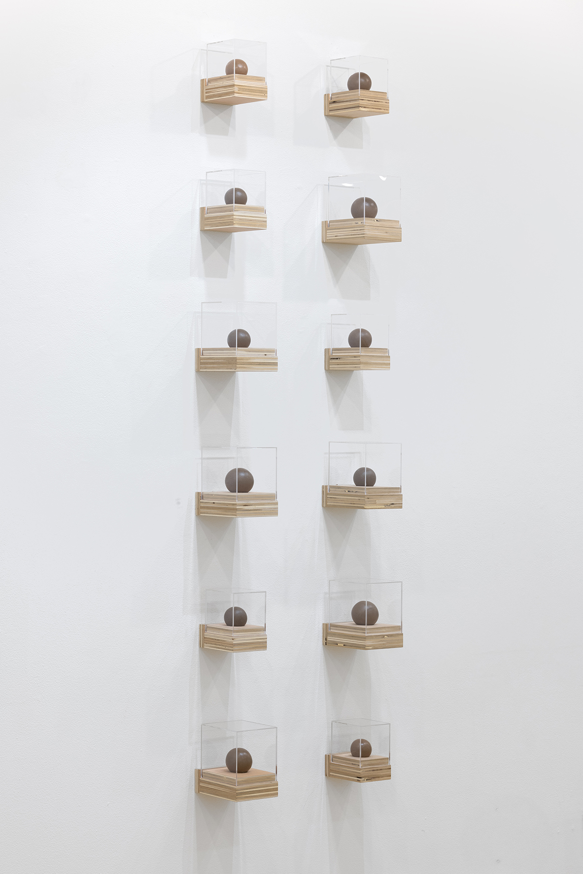 Mun harvests soil from upstate New York watersheds with high concentrations of mycorrhizal networks—the underground webs connecting plant roots with fungal hyphae that allow for the transfer of water, nutrients, carbon, and defense signals across the forest. Mun compresses the excavated earth into hand-formed spheres and then displays them on shelves built from species of trees from the sample site. Compacted through elbow grease and polished with skin oils, these shiny objects function as highly concentrated, auratically dense, embodied samples.