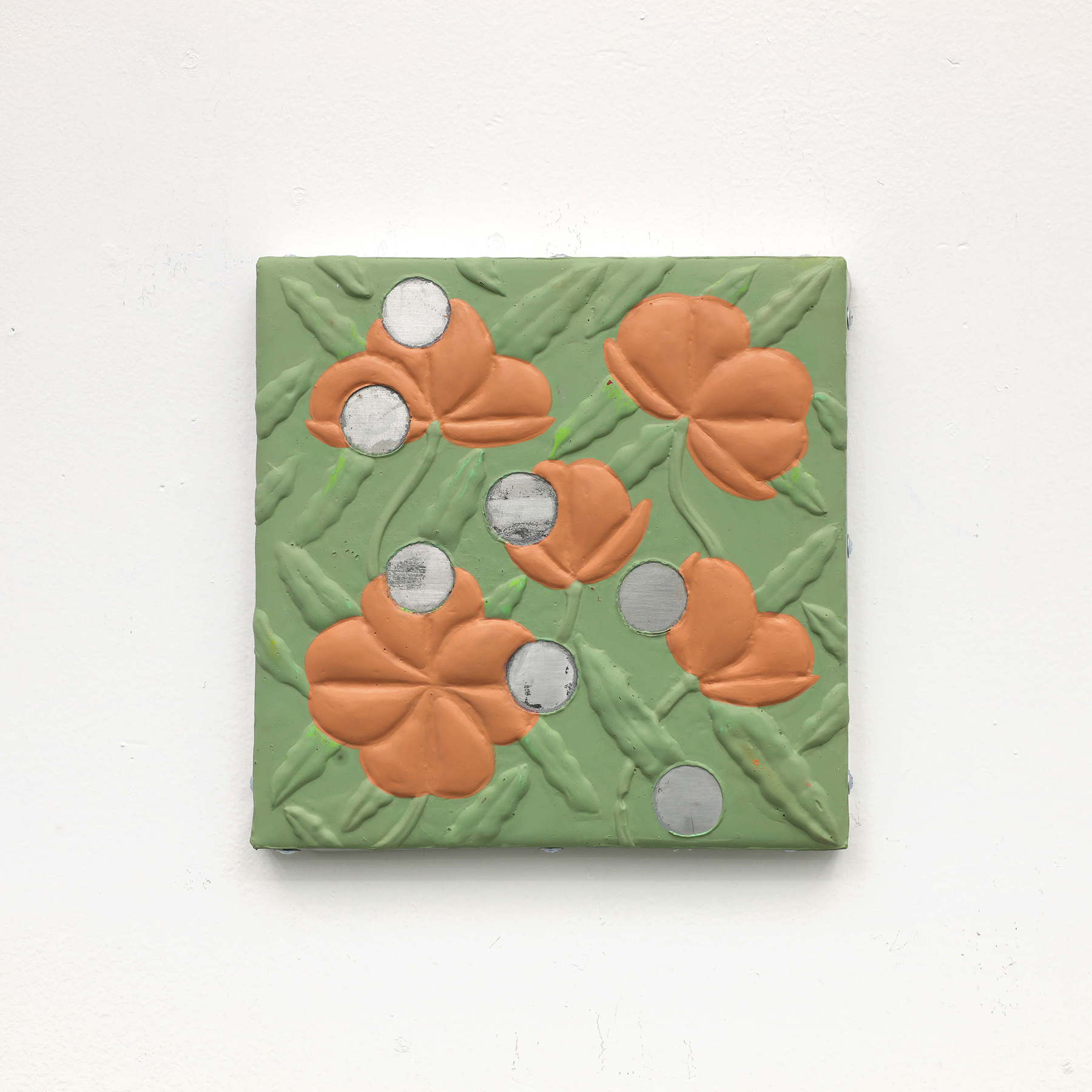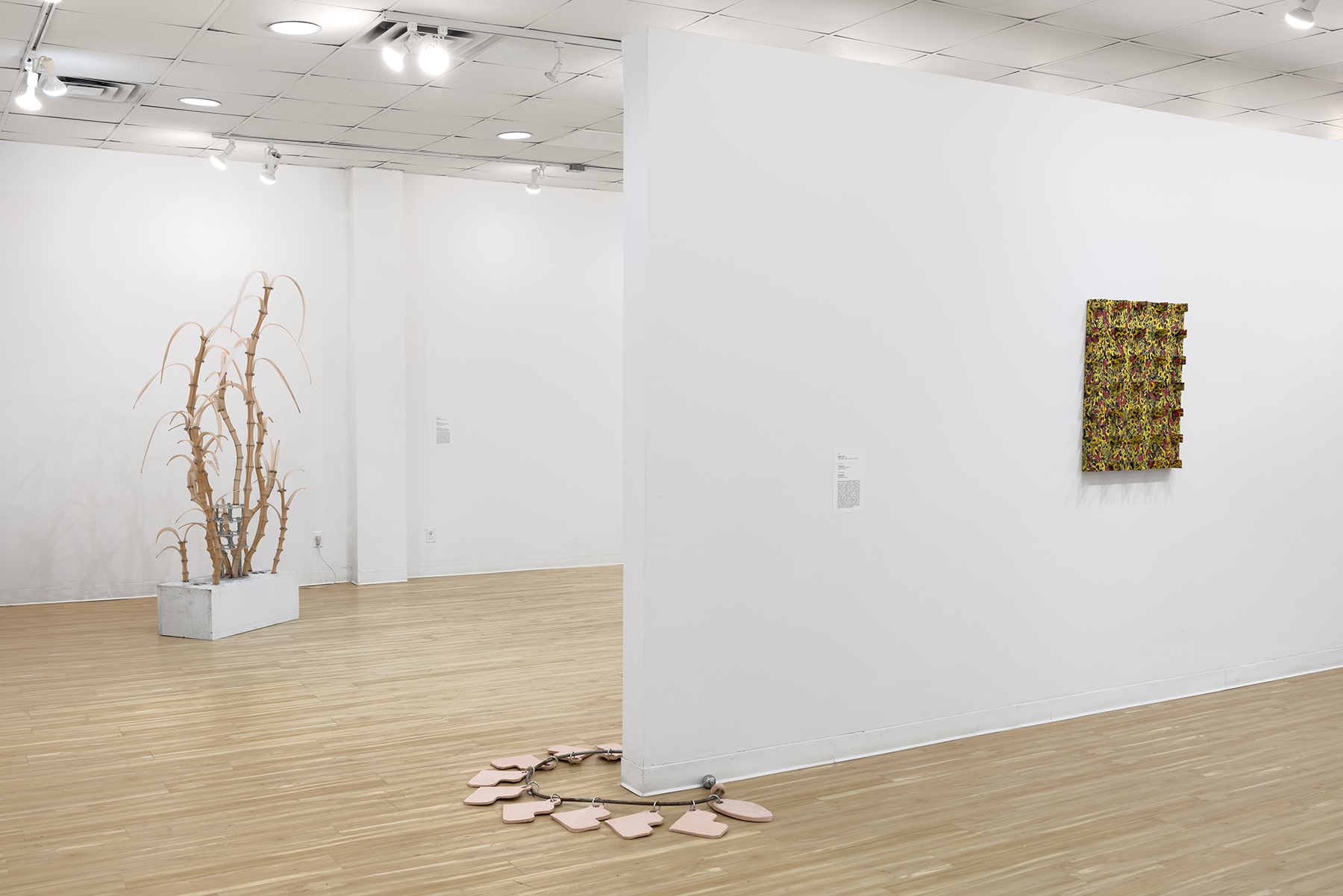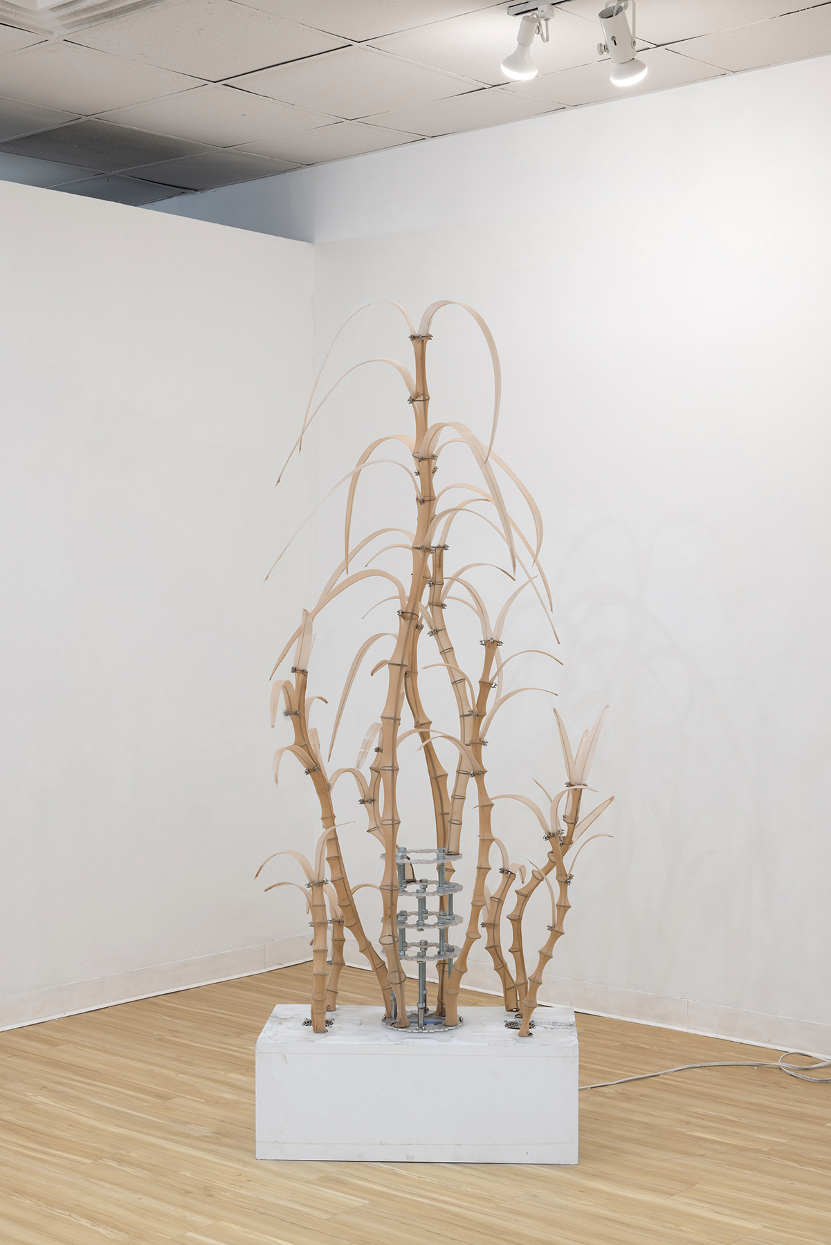 Assiff attempts to reanimate inert concrete tiles, embossed with art deco botanical designs, by smearing them with bioidentical plant-based phytoestrogen and testosterone gels, substituting human hormone therapies for plant VOCs—chemical aromas that signal to pollinators, predators and other plants—in a ham-fisted gesture of anthropomorphism. Chang reverse engineers nodes of sugarcane using welded steel and pantyhose sourced from her family’s hosiery distribution business.