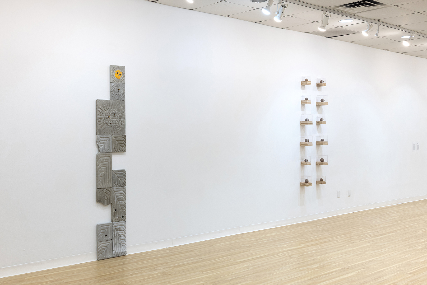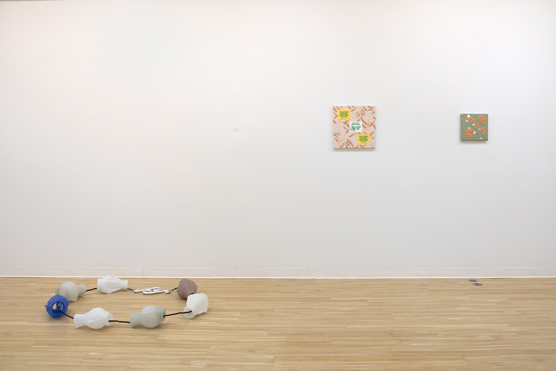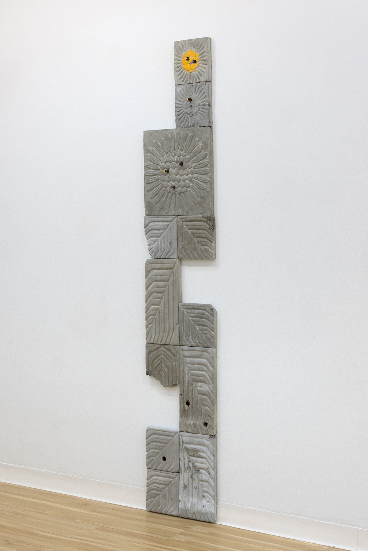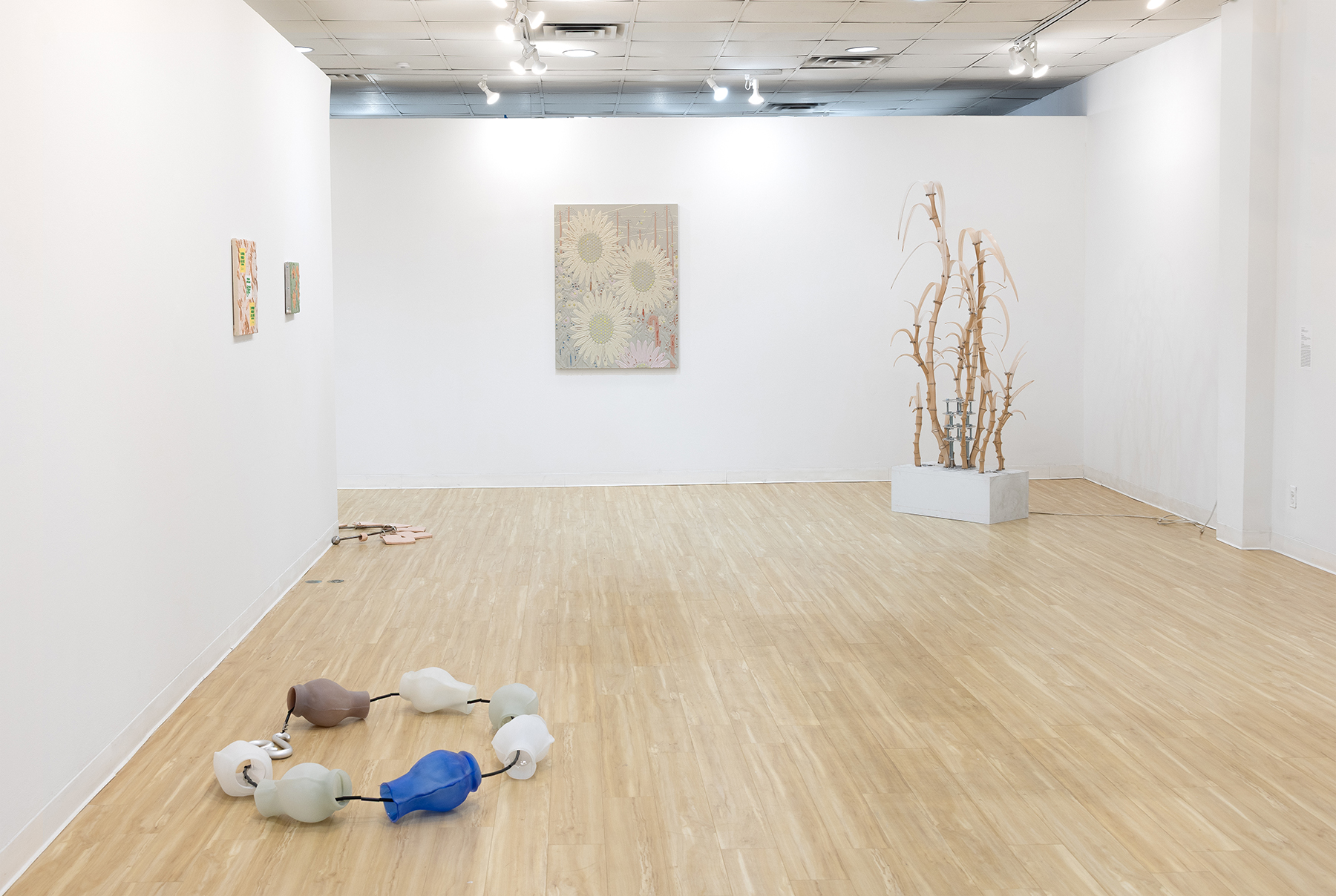 Assiff attempts to reanimate inert concrete tiles, embossed with art deco botanical designs, by smearing them with bioidentical plant-based phytoestrogen and testosterone gels, substituting human hormone therapies for plant VOCs—chemical aromas that signal to pollinators, predators and other plants—in a ham-fisted gesture of anthropomorphism. Chang reverse engineers nodes of sugarcane using welded steel and pantyhose sourced from her family’s hosiery distribution business.