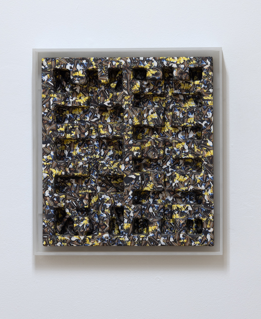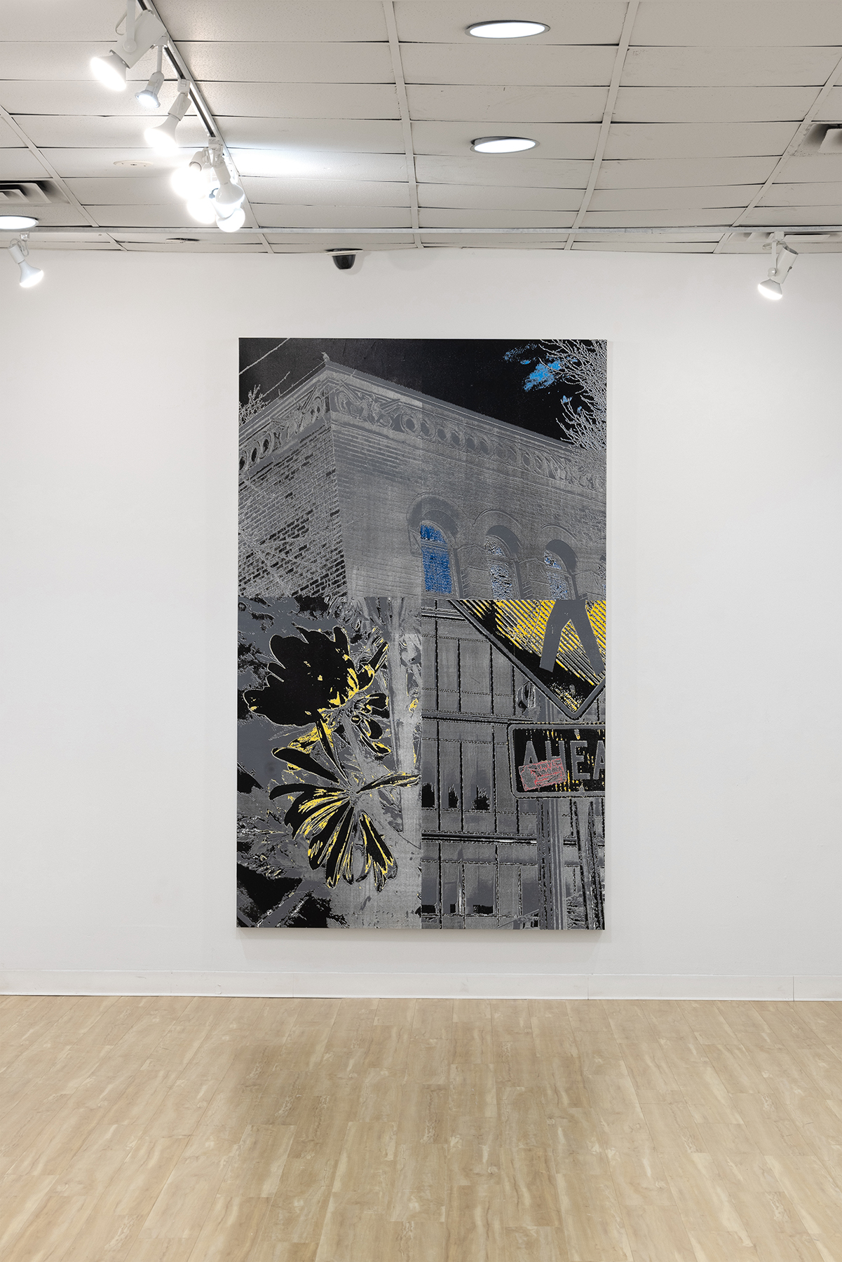 In Debugging the Earth, rendering, in the representational sense, is highly mediated. Chang engages the virtual logic of “skinning” by wrapping extruded foam forms with wallpapered imagery from hosiery product graphic design. Irving’s wall works upsample images aggregated from the internet and personal digital photography, using the magic wand of photoshop to make jagged-edge excisions that get photographically redeveloped into silkscreens; Assiff’s debossed paintings depict plant-covered infrastructure—pesticide treated turf grass, utility poles and buried pipeline—using extruded methacrylic plastic to create a vacuformed-like, polymerized surface.