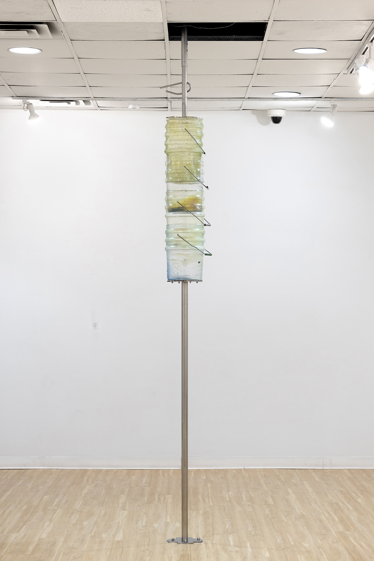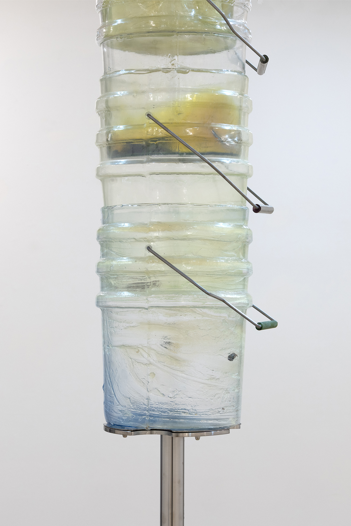 Further within the exhibition, manufactured goods appear in various stages of production: a CVS branded medical bracelet hand rendered in ceramic, at an apparent prototype stage; Leaktite 2 gallon buckets made from hand blown glass, recalling an older technologic stage of manufacturing prior to plastic injection molding; a Bioré mask, over-engineered in rigid corrugated aluminum.